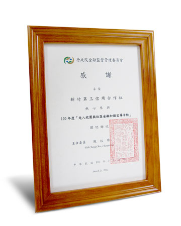◎本社金融知識宣導講師韓華忠高級專員、黃建華經理及張淑貞經理積極參與100年度【走入校園與社區辦理金融知識宣導活動】,獲頒行政院金融監督管理委員會感謝狀。
