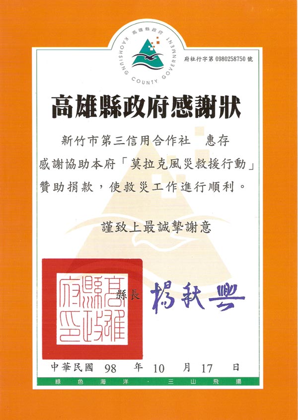 ◎本社為響應莫拉克風災賑災活動,捐款二百伍拾萬元,協助災後重建工作。 |